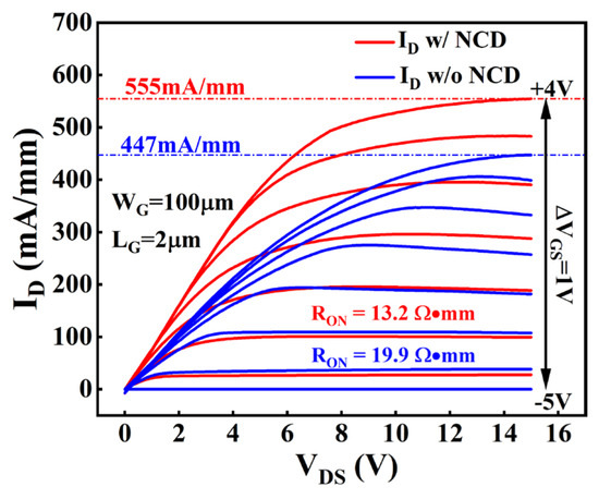 The DC output characteristics of devices with and without the NCD passivation layer are compared in Figure 7. Both devices have a gate length of 2 μm, a gate width of 100 μm, and source-drain and gate-drain distances of 19 μm and 14 μm, respectively. During the test, the drain-source voltage (VDS) ranged from 0 to 15 V and the gate-source voltage (VGS) varied from −5 to 4 V, with a voltage step of 1 V. As shown in Figure 7, the maximum saturation current (IDmax) of the device with the NCD passivation layer reaches 555 mA/mm at a gate voltage of 4 V. Compared with only 447 mA/mm for the device without NCD passivation, the obtained results indicate a 24% increase in IDmax due to the NCD passivation. The increase in current density is mainly due to the reduction in sheet and contact resistance. The on-resistance (Ron) of the device is reduced from 19.9 Ω·mm to 13.2 Ω·mm with NCD passivation, resulting in a reduction of approximately 34%. Additionally, under high-drain voltage conditions, the device with NCD passivation exhibits a smaller decrease in saturation current, further indicating that NCD passivation effectively suppresses the self-heating effect of the device [37]. It can also be observed that both devices show almost the same current density at VGS = 0 V and VDS = 10 V, with an output power density of around 2 W/mm. Although both devices own the same output power density, the junction temperature differs from each other (shown later in Figure 10), which is attributed to the introduction of NCD passivation, which enhances the heat dissipation performance.