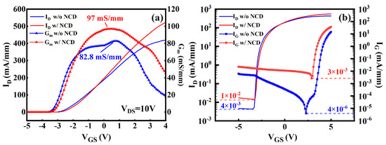 The curves shown in Figure 8 present the transfer and transconductance (Gm) characteristics of devices with and without NCD passivation. The threshold voltage (Vth) of both devices is nearly equal, with the same value of −2.8 V. However, the peak transconductance (Gm,max) of the device with NCD passivation reaches 97.0 mS/mm, and it is 82.8 mS/mm for the device without NCD passivation.