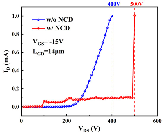 The curves shown in Figure 9 present the breakdown characteristics of devices with and without NCD passivation. The off-state breakdown voltage (Vbr) of the device with NCD is 500 V, which is 100 V higher than that of the device without NCD. The increase in breakdown voltage can be considered as the presence of the NCD passivation layer, which forms a T-shaped gate. This structure is beneficial for optimizing the electric field distribution around the gate region.