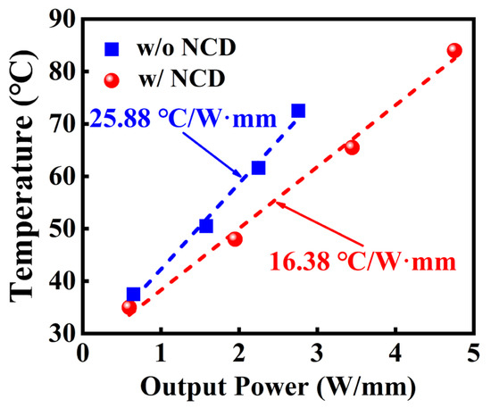 Finally, the thermal characteristics of devices with and without the NCD passivation layer were tested using a FOTRIC infrared thermal imaging system at room temperature. To accurately extract the junction temperature under high power, we use a device with a gate width of 1 mm. The source and gate of the devices were grounded, while the drain voltages were set to 5 V, 10 V, 15 V, and 20 V, respectively. The relationship between the output power density and junction temperature at different drain voltages is shown in Figure 10. It can be observed that the slopes of the junction temperature vs. output power density for the devices with and without NCD passivation are 16.38 °C/W·mm and 25.88 °C/W·mm, respectively, indicating a 36% improvement in heat dissipation efficiency after NCD passivation. From the summary in Table 1, it can be seen that, compared to the previous reports, the fabricated device with a NCD passivation layer in this work has significantly improved the heat dissipation efficiency [26,27,28,31]. These results clearly demonstrate the potential of NCD passivation for enhancing heat dissipation in GaN high-power devices.