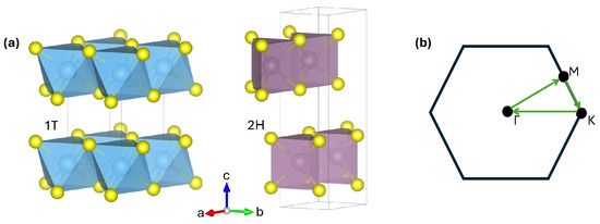 TMDs typically exhibit either an octahedral (1T or CdI2-type) or trigonal prismatic structure [30] (2H or MoS2-type) with the transition metal located within the polyhedra, highlighted in Figure 1. The 1T and 2H structures correspond with space groups 164 () and 194 (), respectively. These polyhedra are extended throughout a material, with hexagonal sheets of transition-metal atoms sandwiched between two hexagonal layers of chalcogenide atoms.