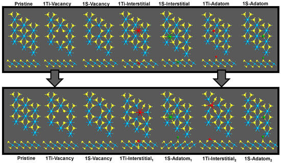 Table 1 shows the formation energy comparison based on the calculated total energies of each respective system with total energy calculated by Equation (1). In a collective total energy analysis of pristine and defect systems, there is an inherent additional if compared to the pristine system calculations done by previous groups due to the additional atom or vacancy. As such, the pristine system of analysis for these formation energy considerations is a 3 × 3 × 1 unit cell with a 20 Å vacuum space and an additional titanium and sulfur atom within the vacuum space. This ensures that we compare the energetic contributions solely from the interactions rather than additional or vacant atoms. Interactions between lattice and additional atoms are negligible due to a separation of no less than 7 Å between them.