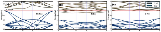 Band structures for (a) a pristine 3 × 3 × 1 monolayer cell, indicating a semiconducting system with a band gap of 0.422 eV, (b) the 3 × 3 × 1 cell with an additional titanium atom shifts the cell to a metallic electronic ground state, and (c) a 3 × 3 × 1 cell with a sulfur vacancy that corresponds to a similar metallic shift; however, there are fewer bands present at the Fermi level.