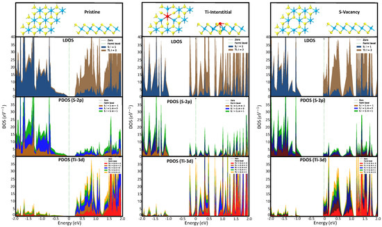 Figure 3 and Figure 4 show the pristine system calculation predicting sulfur 2p bands comprising the majority of valence band contributions, suggesting that the sulfur 2p orbitals are completely occupied within a net neutral system. The valance band maximum is located at the -point, eV below the Fermi level. The highest valence band at the M- and K-points is slightly less than 1.0 eV below the absolute maximum at the -point. As such, it requires energy for occupied electronic states to move within the reciprocal space and respective real-space positions. The conduction band is comprised mainly of titanium 3d contributions, and we observe a direct band gap of 0.422 eV at the -point and an indirect band gap between the sulfur 2p-dominated valance band at the -point and titanium 3d-dominated conduction band at the M-point of 0.273 eV.