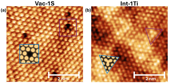 Given that the contrast from STM images comes directly from the local density of states [57] and thus electron density, we can directly compare calculated electron density maps of monolayer TiS2 with respective point defects present in the STM images of the bulk TiS2 sample. In Figure 5a, the computational monolayer with sulfur vacancy calculates a strikingly similar geometry of an electron density map to the contrast demonstrated within the STM images of the bulk TiS2. The geometry that arises from the sulfur vacancy is a result of the lack of electron density within this region, which is also reflected within the STM image.