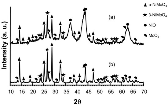 For the PrecEtOH(2 h) sample (Figure 1a), well-defined peaks are observed at 2θ = 14.14°, 25.08°, 26.48°, 28.75° and 32.5°, and broad peaks at 2θ = 37.26°, 43.21° and 62.8°. The well-defined peaks located at 2θ = 14.14°, 25.08°, 28.75° and 32.58° are characteristic reflections of the α-NiMoO4 compound (JCPDS 33-0948 card). A signal is observed at 2θ = 26.48°, which is characteristic of the crystallographic structure of β-NiMoO4 (JCPDS 45-0142), also reported by Liu et al. [13]. The broad signals at 2θ = 37.26°, 43.21° and 62.8° are assigned to characteristic reflections of NiO (JCPDS 71-1179). With less intensity, the characteristic reflections of MoO3 (JCPDS 5-0508) are observed at 2θ = 13.13, 20.70, 22.88, 25.24, 30.06, 51.23, 60.76, 62.33 and 66.47. In contrast, the diffraction pattern of PrecEtOH(6 h) (Figure 1b) shows well-defined reflections at 2θ = 14.11°, 25.19°, 26.38°, 28.70°, 32.54°, 43.72° and 47.34 which correspond to the reflections of the α-NiMoO4 (JCPDS 33-0948 card). Reflections at 2θ = 23.23°, 26.38°, 27.06° and 33.59° are associated with the β-NiMoO4 (JCPDS 45-0142 card) [13]. The main difference between the diffraction patterns in Figure 1a is that on the PrecEtOH(2 h) sample, NiO has not yet been integrated into the structure of NiMoO4; the behavior can be attributed to the shorter solvothermal synthesis time (crystallization time) of only 2 h. For the PrecEtOH(6 h) sample, the characteristic signals of NiO are observed with less intensity; it is assumed that it has already been incorporated into the crystalline structure of NiMoO4 (phases α and β), as observed in Figure 1b. The two samples present mixtures of both phases α and β of NiMoO4. Furthermore, with a greater synthesis time, an increase in intensities, a smaller peak width and a more defined baseline were observed, all signs that the material has a better crystalline arrangement; these results are similar to those reported in [13,14].