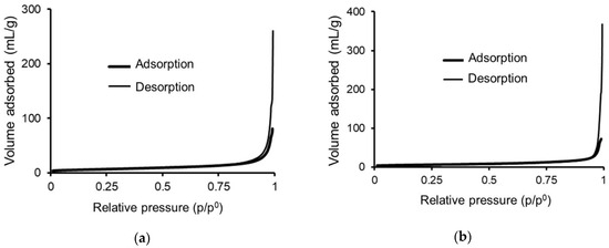 The characteristic isotherms of the catalytic precursors synthesized in their oxide phase are shown in Figure 3a,b. The isotherms of the catalytic precursors PrecEtOH(2h) and PrecEtOH(6h) correspond to type III isotherms of the IUPAC classification and do not have hysteresis loops. This is characteristic of non-porous materials [16]; therefore, as expected, the synthesized crystals are not porous.