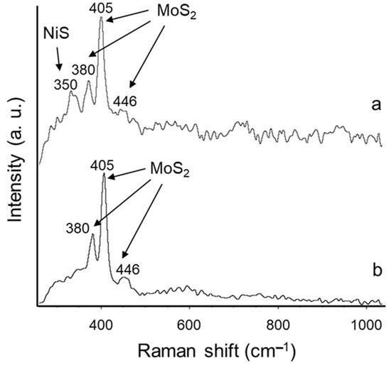 The Raman spectrum of the sulfurized bulk catalyst, CatEtOH(2 h), in Figure 5a, shows bands at 350, 380, 405 and 446 cm−1, the most intense being located at 380 and 405 cm−1. The band at 350 cm−1 is assigned to Ni-S bond vibrations [18]. The strong bands at 405 and 380 cm−1 and the weak one at 446 cm−1 correspond to MoS2 [19]. In Figure 5b, the Raman spectrum of CatEtOH(6 h) is observed, with bands at 380, 405 and 446 cm−1. This corresponds to MoS2; unlike the Raman spectrum of CatEtOH(2 h), it does not show the signal at 350 cm−1, which is assigned to the Ni-S bond.