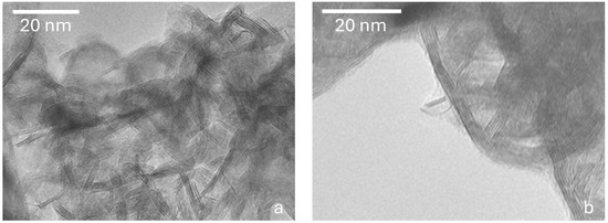 The sulfided bulk catalysts were characterized by HR-TEM. The high-resolution transmission micrographs of the sulfided bulk catalysts CatEtOH(2 h) and CatEtOH(6 h) are presented in Figure 6a and Figure 6b, respectively.