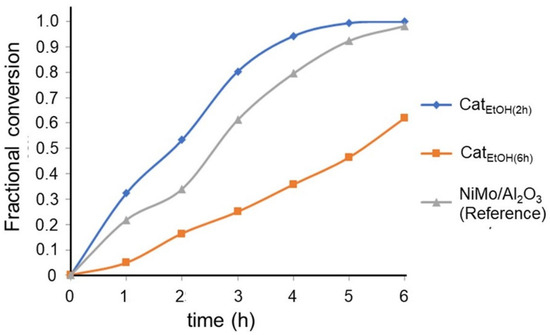 The conversion of hydrodesulfurization of 4,6-DMDBT versus the time of reaction of our samples is shown in Figure 7. The most active catalyst was CatEtOH(2 h), which reached a total conversion of 4,6-DMDBT at the reaction time of 5 h; the CatEtOH(6 h) catalyst only reached a conversion of 0.6 of 4,6-DMDBT after 6 h. When comparing these bulk catalysts against a reference catalyst, NiMo/γ-Al2O3, the CatEtOH(2 h) catalyst performed better than the reference.
