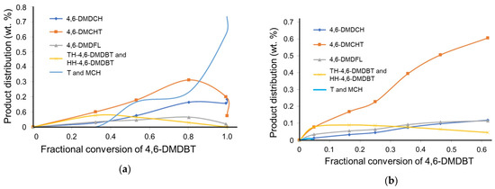 For CatEtOH(6 h), it can be observed from Figure 8b that as the conversion of 4,6-DMDBT increases, the concentration of 4,6-DMCHT also increases. The hyd-4,6-DMDBT compounds are observed at a maximum at low conversion of 4,6-DMDBT (0.2). As the conversion of 4,6-DMDBT increases, the concentration of hyd-4,6-DMDBT decreases. The concentration of 4,6-DMDFL and 4,6-DMDCH increases. Only traces of other products, such as light hydrocarbons (T and MCH), are observed.