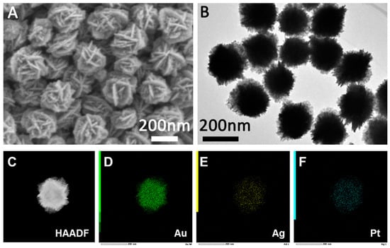 SEM (A) and TEM (B) images of the prepared AuAgPt nanoparticles. (C) HAADF-STEM image and (D–F) corresponding elemental mappings of the AuAgPt nanoparticles.