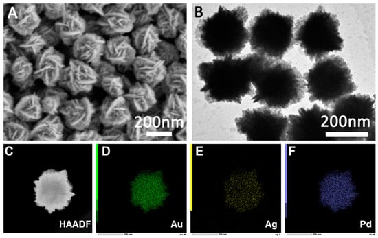 SEM (A) and TEM (B) images of the prepared AuAgPd nanoalloys. (C) HAADF-STEM image and (D–F) corresponding elemental mappings of the AuAgPd nanoparticles.