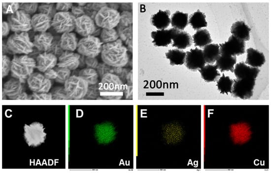 SEM (A) and TEM (B) images of the prepared AuAgCu nanoparticles. (C) HAADF-STEM image and (D–F) corresponding elemental mappings of the AuAgCu nanoparticles.