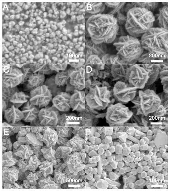 The concentration of the reducing agent significantly influences the reduction rate and consequently dictates the reaction kinetics. In this study, we employed ascorbic acid (0.4 M) as the reducing agent to convert metal precursor ions into trimetallic nanocrystals. By varying the concentration of ascorbic acid in the reaction system, we investigated its impact on the resulting nanocrystals. Specifically, we added (A) 3.0 mL, (B) 2.5 mL, (C) 2.0 mL, (D) 1.0 mL, (E) 0.5 mL, and (F) 0.2 mL to the reaction system for the reduction process, with the corresponding SEM images of the prepared nanocrystals depicted in Figure 4. The addition of 3.0 mL resulted in irregular gold nanocrystals (Au NCs), as illustrated in Figure 4A. When the volume of ascorbic acid was reduced to 2.5 mL, 2.0 mL, 1.0 mL, 0.5 mL, and 0.2 mL, we obtained distinct AuAg NCs, as shown in Figure 4B–F, respectively. The corresponding HAADF-STEM and EDS mappings was shown in Figure S8. Notably, as the amount of reducing agent decreased, the petal structures of the flower-like AuAg NCs gradually diminished (Figure 4C,D). At a reducing agent volume of 0.5 mL, the quantity was insufficient to produce flower-like AuAg NCs, resulting instead in irregular particles (Figure 4E). Further reduction to 0.2 mL yielded irregular polyhedral particles (Figure 4F). In summary, an excessive amount of reducing agent accelerates the nucleation of Au NCs, leading to the formation of irregular small gold nanoparticles. Conversely, a decrease in reducing agent concentration slows the formation rate of gold atoms, resulting in preferential deposition of newly formed gold atoms onto the existing gold nano-petals, which makes the petals of the flower-like nano-Au less numerous and thicker. This result is consistent with previous reports [36]. When the concentration of the reducing agent is too low, it becomes inadequate to reduce the formed AgCl, preventing the production of hollow flower-like AuAg NCs.