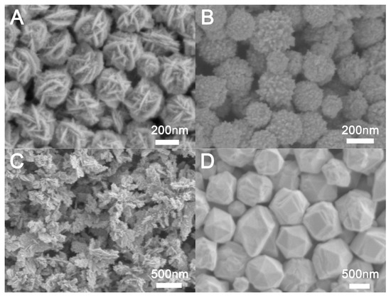 PVP not only controls the formation of precursor nanoparticles at the initial stage of the reaction, but also controls the morphological transformation of nanostructures grown on it [37]. To investigate the impact of ligands on the synthesis of Au NCs, we examined both the absence of ligands and the application of PVP, CTAC, and PDDA as ligands. As illustrated in Figure 5A, the addition of PVP results in the formation of flower-like nanocrystals. In contrast, the absence of a ligand yields spherical nanocrystals, as depicted in Figure 5B, which are characterized by a surface covered with island-like gold nanospheres. The use of PDDA leads to the production of dendritic Au NCs, as shown in Figure 5C. When CTAC is employed as a ligand, irregular gold nanoparticles are obtained, as seen in Figure 5D. These observations suggest that PVP is crucial for the formation of flower-like Au NCs. Research findings indicate that PVP exhibits stronger binding affinity to the {111} facets of gold nanoparticles compared to the {100} facets, resulting in the preferential formation of Au {111}-rich surfaces [38,39]. This is consistent with our XRD experimental results. Additionally, we investigated the effect of varying amounts of PVP on the hollow flower-like structure. When the PVP concentration was reduced to 10 mg, irregular nanocrystals were produced, as shown in Figure S9. The regular flower-like structure was no longer evident, indicating that an adequate amount of PVP is necessary for the formation of the flower-like structure.