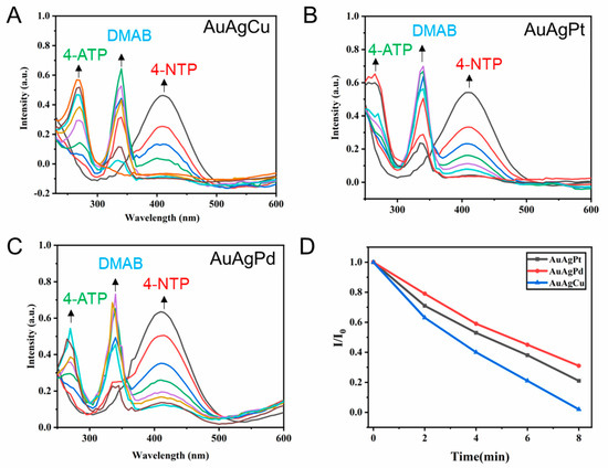 When AuAgPt nanoalloy was used as catalyst (Figure 6B), the complete conversion of 4-NTP required 12 min. However, when AuAgPd nanoalloy was used as catalyst (Figure 6C), the peak of 4-NTP at 410 nm still existed when the reaction was carried out for 14 min, indicating that the reactant was still not completely reacted. Furthermore, we compared the time required for the conversion of 4-NTP under different catalyst conditions to investigate the catalyst activity. As shown in Figure 6D, we recorded the ratio of the UV–vis spectral absorption peak intensity of the reactant 4-NTP to the initial intensity of the reaction 8 min before the reaction. It can be seen from the Figure 6A that the reactants are basically completely converted under the action of AuAgCu catalyst, and the reactants are completely converted within 8 min under the conditions of AuAgPt and AuAgPd catalysts, and the catalytic activity of AuAgPt is stronger than that of AuAgPd.
