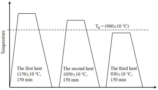 The TLC002 alloy was smelted by a vacuum arc remelting (VAR) furnace ZHT001 according to the nominal composition (patent pending). The chemical composition of the ingot is displayed in Table 1. The measured α/β phase transition temperature (Tβ) of the TLC002 alloy is at 960 ± 10 °C by means of metallographic analysis. The three-heat forging process is shown in Figure 1. The forging deformation was about 70% by upsetting and stretching three times for each heat. To avoid the oxidation of the surface during heating for forging and the forging process, the ingot was ground to remove the surface oxide layer after each time of forging.