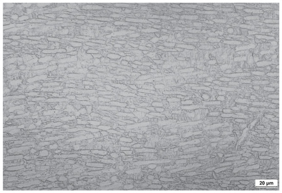 The specimens were treated using a chamber electric resistance furnace KSL-1200. Two heat treatment methods were developed: (1) specimens were firstly solution treated at (Tβ—60, 40, 20) °C for 1 h followed by air cooling (AC), and then aged at 500 °C for 4 h followed by air cooling (AC); (2) specimens were annealed at (Tβ—160, 120, 80) °C for 1.5 h followed by air cooling. There are six independent samples for each variant subjected to identical testing conditions in both the tensile and the impact tests. Each presented value is the average of the six results. The mechanical properties were tested by Instron 1195 electronic universal testing machine according to the National Standard [34]. Impact toughness tests were conducted by using the NI300C instrumented Charpy impact testing machine under the National Standard [35]. The schematic diagrams of the dimensions of the tensile specimen and impact specimen, together with the major equipment used during the research, are shown in the Supplementary Material. The microstructure was observed by Olympus MG3 optical microscopy (OM) and JSM-IT510-JEOL (SEM). The fracture morphology was observed by SEM and grain deviation was measured by Image-Pro-Plus analysis software (Version 6.0.0.260). As Figure 2 shows, the microstructure after forging is a uniformly distributed equiaxed structure, including equiaxed primary α phase (αp) and β transition matrix (βt). Both the equiaxed and the bimodal structures are distributed αp and βt. There are secondary α phase (αs) distributed on the βt. The amount of αp is about 56.48%, with an average grain size of 15.30 μm.
