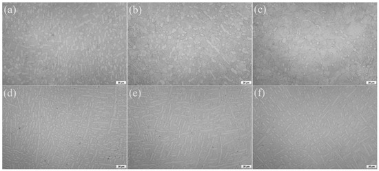 Optical metallographs of the TLC002 alloy under solid solution and aging (a) 900 °C/1 h, AC + 500 °C/4 h, AC; (b) 920 °C/1 h, AC + 500 °C/4 h, AC; and (c) 940 °C/1 h, AC + 500 °C/4 h, AC; together with specimens under annealing; (d) 800 °C/1.5 h, AC; (e) 840 °C/1.5 h, AC; and (f) 880 °C/1.5 h, AC.
