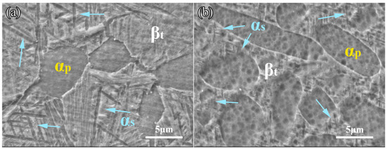 Microstructures of the TLC002 alloy under (a) solid solution and aging (920 °C/1 h, AC + 500 °C/4 h, AC), and (b) annealing (840 °C/1.5 h, AC). The blue arrows stand for the αs.