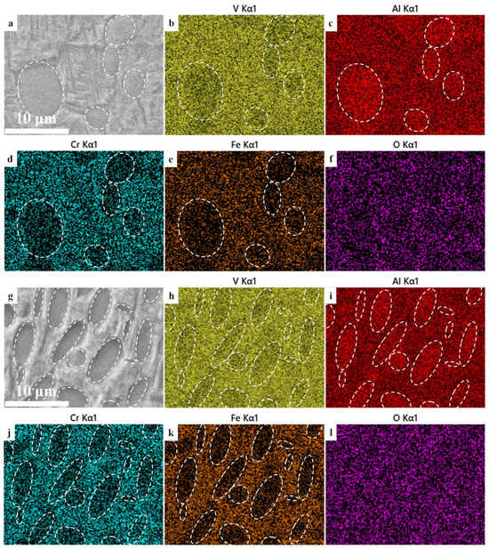 Figure 5 exhibits the microstructures and concentration distributions of alloying elements of the TLC002 alloy treated with solid solution and aging (900 °C/1 h, AC + 500 °C/4 h, AC) and annealing (840 °C/1.5 h, AC). The microstructure shown in Figure 4a (900 °C/1 h, AC + 500 °C/4 h, AC) is a bimodal structure with αp phases distributed on βt. The TLC002 alloy was treated with solid solution in the two-phase region. Due to the element partition effect, Al is enriched in the αp phase (Figure 5c). The enrichment of Al can enhance the effect of solid solution strengthening [36]. The concentration of V, Cr, and Fe in the α phase is lower than that in the βt phase (Figure 5b,d,e). According to Figure 5f, the O element is uniformly distributed within αp and βt phases. The concentration distribution of O shows rarely significant differences. As Figure 5g displays, the annealed TLC002 alloy (840 °C/1.5 h, AC) shows equiaxed α phases distributed on βt. Similarly, the enrichment of Al can be observed in the α grains (Figure 5i). The distributions of V, Cr, and Fe in the βt phase are relatively more than that in the α phase (Figure 5h,j,k), while the O element shows no evident concentration gradient between the α and βt phases (Figure 5l). Generally, in the alloy with different heat treatments, Al is enriched in the αp phase. The β-stable elements V, Cr, and Fe appear more in the βt phase than the α phase, whereas the interstitial O atoms are evenly distributed in both α and βt phases.