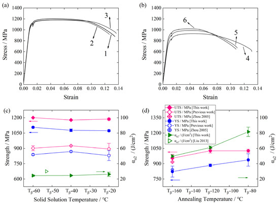 The representative stress–strain curves of the TLC002 alloy under (a) solid solution and aging (1) 900 °C/1 h, AC + 500 °C/4 h, AC; (2) 920 °C/1 h, AC + 500 °C/4 h, AC; (3) 940 °C/1 h, AC + 500 °C/4 h, AC, as well as (b) annealing (4) 800 °C/1.5 h, AC; (5) 840 °C/1.5 h, AC; (6) 880 °C/1.5 h, AC. The tensile strength (UTS), yield strength (YS), and impact toughness (αu2) of the TLC002 alloy treated with (c) solid solution and aging, and (d) annealing. For comparison, the previous data and available experimental results [38,39] are also displayed.