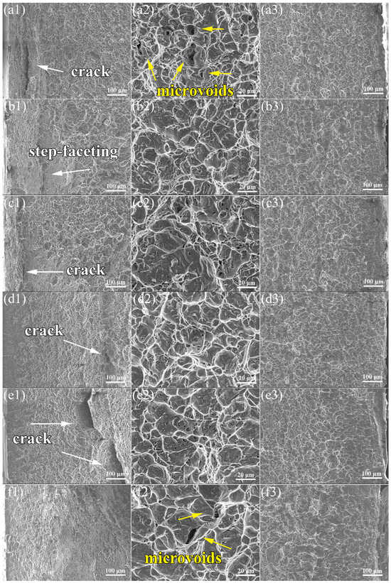 The crack initiation, propagation, and final fracture zones of the impact fracture appearances of the specimens for the TLC002 alloy are characterized. According to Figure 8a2–f2, dimples can be observed in the crack propagation zones for both the bimodal and equiaxed structures, indicating that the large plastic deformation occurred, and the ductile fracture developed. In line with the reported results [18], the final fracture zones for both the solid-soluted specimens (Figure 8a3,b3,c3) and the annealed specimens (Figure 8d3,e3,f3) are relatively flat. However, different from the research [18], cracks (Figure 8a1,c1) and step-faceting (Figure 8b1) can be observed in the crack initiation zones for solid-soluted specimens. Also, there are several cracks observed in the crack initiation zones of the annealed specimens (Figure 8d1,e1).