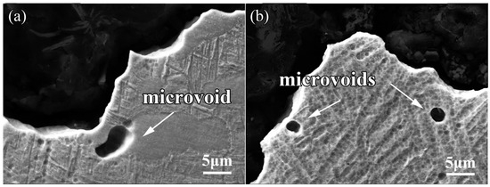 The microstructures of the sections for the impact fractures were analyzed. As is exhibited in Figure 9a, for the bimodal structures, voids tend to originate at the αp/βt interface then expand along the αp/βt interface, in line with the reported results [18]. The crack is located at the grain boundary and cut through the βt, resulting in the formation of small dimples on the fracture surface. The region of βt is softer compared to the α phase, thus the plastic deformation is precedent to occur at the βt phase. Due to the Burger’s vector between the lamellar α and β in the βt phase, the dislocations can easily go through the β/α interface. However, the large orientation difference of the αp/βt interface increases the difficulty for dislocations to slip, thus leading to the dislocation pile-up and the concentration of stress at the αp/βt interface. The coordinated deformation of αp and βt can alleviate the concentration of stress to some extent, resulting in the characteristics of microstructure deformation. During the crack propagation, the soft region of βt tends to have plastic deformations and is constrained by surrounding αp grains, leading to torsional deformation of βt. Some of the cracked αp and deformation bands generated in the αp phase can also consume part of the impact energy. The synergistic effect of the torsional deformation for βt and the plastic deformation for αp can effectively release the stress at the crack tip, thus the crack initiation and propagation require more energy. Though the amount of the αp phase in the equiaxed structures is higher than that in the bimodal structures, the length/width ratio of the βt phase in the equiaxed structures is rather large. Different from the reported research [22], the αs of the equiaxed structures is finer than that of the bimodal structures, therefore the crack in the bimodal structures propagates more easily than that in the equiaxed structures.