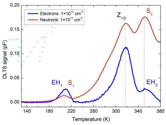 DLTS spectra for low-energy electron irradiated (blue) and neutron irradiated (red) n-type 4H-SiC samples. Data taken from Ref. [37].