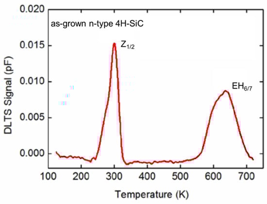 Moreover, significant efforts were also undertaken to resolve the broad EH6/7 peak (Figure 4). Danno et al. [53] have successfully distinguished EH6 and EH7 through simulations of the Fourier-transform DLTS spectrum of the EH6/7 peak. Later, direct evidence that EH6/7 comprises two distinct components was provided by Alfieri et al. [54]. They have identified two separate energy levels, 1.30 eV and 1.49 eV, corresponding to EH6 and EH7, respectively.