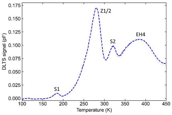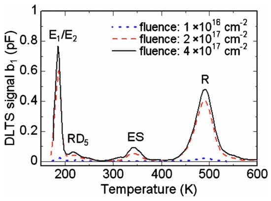 Figure 9 shows DLTS spectra of as-irradiated n-type 6H-SiC. The low-energy electron irradiation (E = 150 keV) with fluencies 1 × 1016, 2 × 1016, and 4 × 1017 cm−2 was used [68]. It should be noted that E1/2 (0.45 eV) and R (1.25 eV) traps were already present in the DLTS spectrum for as-grown 6H-SiC materials, while RD5 (0.57 eV) and ES (0.80 eV) traps are observed only after low-energy electron irradiation.