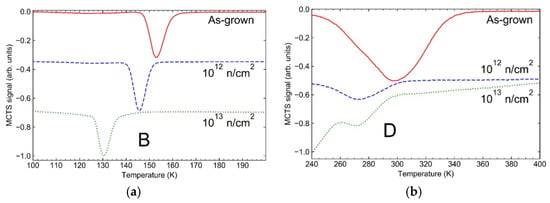Storasta et al. [62] investigated this issue by employing MCTS to examine the effects of unintentional boron incorporation in low-doped n-type 4H-SiC. The SiC samples were grown using a hot-wall CVD process. Their findings confirmed earlier reports that boron introduces two distinct deep levels, referred to as shallow boron (B) and deep boron (D-center). Figure 8 shows MCTS spectra for as-grown and neutron irradiated n-type 4H-SiC samples: (a) shallow boron, B and (b) deep boron, D-center. The activation energies for hole emissions for B and D-center are estimated as EV + 0.28 eV and EV + 0.61 eV, respectively [34,62,63,64,65].