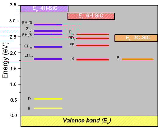 - Sasaki, S.; Kawahara, K.; Feng, G.; Alfieri, G.; Kimoto, T. Major Deep Levels with the Same Microstructures Observed in n-Type 4H-SiC and 6H-SiC. J. Appl. Phys. 2011, 109, 013705. [Google Scholar] [CrossRef]