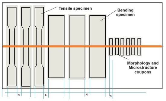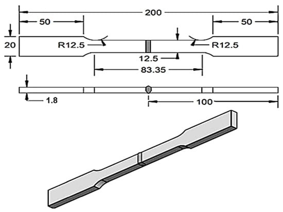 The tensile tests were carried out at room temperature (24 °C). They were performed with a computer-controlled electro-hydraulic servo universal testing machine model WAW-300E (Jinan testing equipment IE, Jinan, China). The crosshead speed was 0.5 mm/min, the loading rate was 0.5 kN/s, and the strain rate was 1.6 × 10−4 s−1. The specimens were cut according to ASTM E8M-04, as shown in Figure 3. The tensile tests were carried out on 3 samples of each type of electrode.