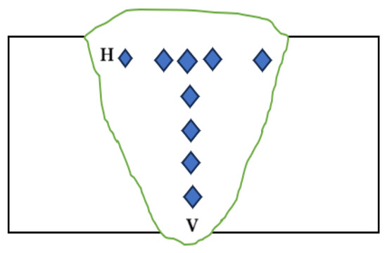 Vickers hardness tests were performed by a digital hardness tester model HVS-50 (SCTMC, Shanghai, China) with a standard load of 10 Kgf and a dwell time of 10 s. The test was conducted according to the ASTM E-384-99. Figure 2 displays the hardness line(horizontally and vertically) and track indentation. The measurements were performed on each sample using E6013 and IMAN-7 electrodes. The hardness line measurements are far from the top surface by 0.75 mm.