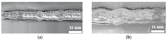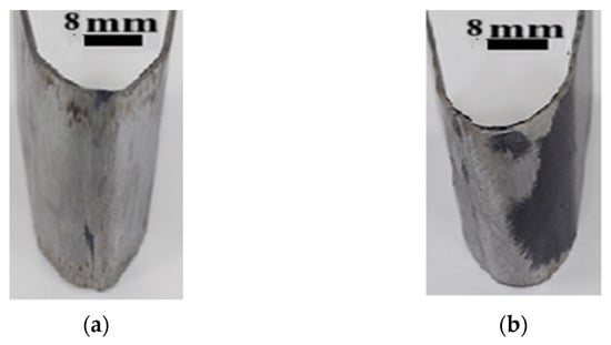 Figure 5 and Figure 6 show photographs of the welded joints captured from the welding side (Figure 5a and Figure 6a) and back side (Figure 5b and Figure 6b) during welding with the investigated electrodes E6013 and IMAN-7. On the back side of the welded plates, the bead formed using the IMAN-7 electrode demonstrated a smooth surface and full penetration through the entire thickness of the metal (Figure 6b). In contrast, the beads on the plates welded with the E6013 electrode did not exhibit complete penetration (Figure 5b).