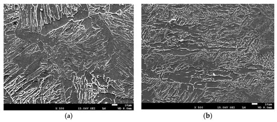 Bead zone SEM images of specimens welded using the ESAB E6013 electrode (a) and IMAN-7 electrode (b) (500×).