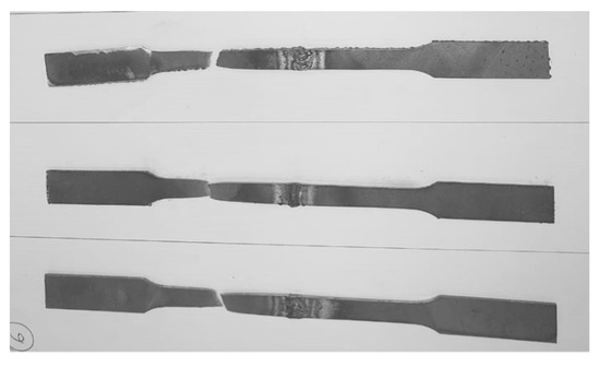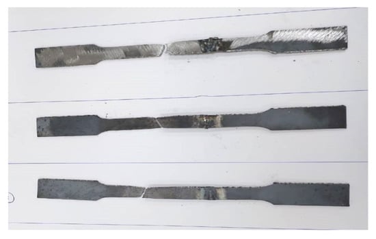 Figure 11 and Figure 12 show images of the specimens after the tensile testing of the AISI 1017 welded steel beads made using the E6013 and IMAN-7 electrodes. The tensile test results indicate that all welded specimens fractured in the base metal, regardless of the welding electrode used.