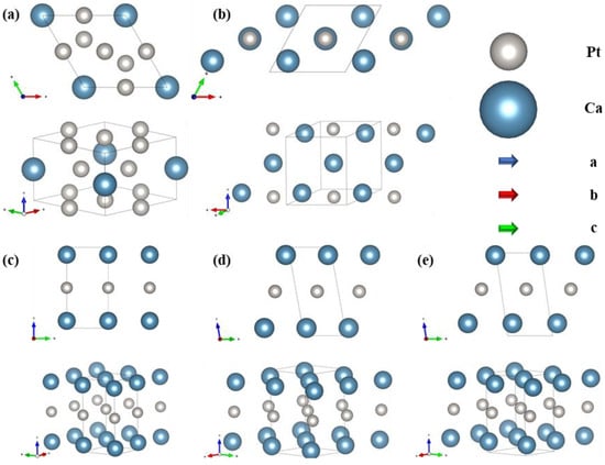 To ascertain the predicted characteristics and stability of the structure, it has been optimized and a comprehensive structural diagram was prepared, as shown in Figure 2. The CaPt5 phase, characterized by the P6/mmm symmetry, adopts a rhombohedral cell structure with equal lengths of 5.4 Å on the a and b-axes and 4.4 Å on the c-axis. The lattice vector angles are α = β = 90° and γ = 120°. In this structure, the Ca atoms are located at the midpoint along the c-axis, and the Pt atoms are distributed in two distinct positions within the cell. One Pt atom resided at the midpoint of the 110-face edge, centered on the face. The other is positioned at the intersection of cell vectors a–b, forming an equidistant distribution bounded by Ca atoms along the c-axis. The Pt atoms within the crystal cell exhibit a uniform interatomic spacing of 2.7 Å, with the shortest distance being 3.1 Å between Ca and Pt atoms. At ambient pressure, the Ca3Pt phase maintained a symmetry of P4/mmm (Figure 2b) and assumed a rhombohedral structure analogous to that of the CaPt5 phase at the same pressure level. The a and b-axes’ lengths are 5.08 Å, and the c-axis’s length is 5.89 Å. The lattice vector angles are α = β = 91.3° and γ = 61.5°. The Ca atoms were evenly distributed along the diagonal body of the cell vector a + b − c, with an interatomic spacing of 3.66 Å. The Pt atoms were located at face-centered positions on the 110 faces of the cell, and the minimum distance between these atoms and the Ca atoms was 2.9 Å.