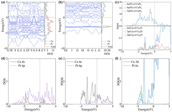 The properties of atoms are profoundly influenced by their electronic structure, which in turn exerts a decisive impact on the physical and chemical properties of compounds. The density of states (DOS), projected density of states (PDOS), and energy band structures of the ground-state configurations of Ca3Pt and CaPt5 were calculated. Both Ca3Pt and CaPt5 intermetallic compounds have several bands that cross the Fermi level, which is characteristic of metallic behavior (Figure 4a,b). Similarly, the energy bands that cross the Fermi level exhibit a relatively steep trend, and a large energy gradient results in higher electron velocities. However, the reasons for this phenomenon are different. Below and at the Fermi level, the electronic states of the CaPt5 structure are primarily attributed to the 5d orbitals of the Pt atoms, whereas the electronic states of the Ca3Pt structure are jointly contributed by both Ca and Pt atoms. Furthermore, the contributions from various orbitals of the Ca atoms were balanced, as shown in Figure 4c.