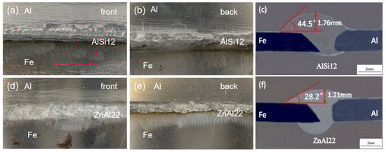 Macroscopic morphology of Al/steel joints welded using (a–c) AlSi12- and (d–f) ZnAl22-filler wires, respectively.