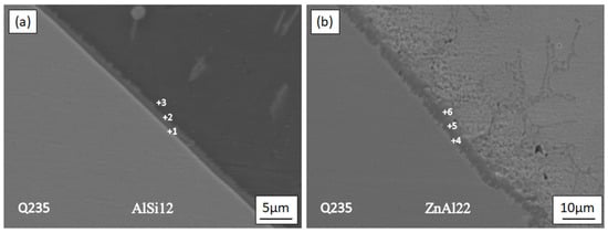 SEM morphology of brazing zones within joints made with (a) AlSi12- and (b) ZnAl22-filler wires, respectively.