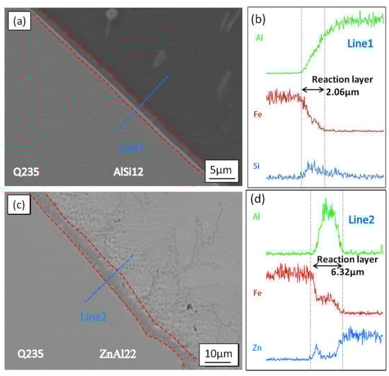 EDS line scanning of steel-side brazing zones within joints using (a,b) AlSi12 or (c,d) ZnAl22.