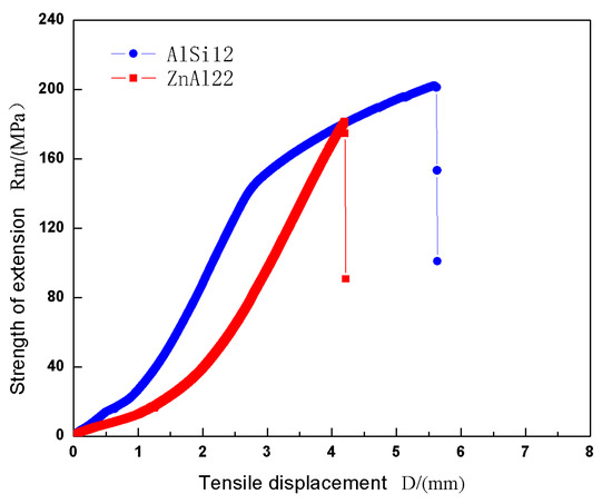 Figure 5 illustrates the tensile strength and displacement curves of the joints welded using AlSi12- and ZnAl22-filler wires. The tensile strength of the joint welded with AlSi12-filler wire was observed to be 203 MPa, with a corresponding tensile displacement of 5.8 mm. The tensile strength of the joint using ZnAl22-filler wire was 186 MPa, and the tensile displacement measured 4.5 mm. Despite the superior wetting properties exhibited by ZnAl22-filler wire, its mechanical characteristics were found to be less favorable compared to those of AlSi12-filler wire. The reason is that Si can diffuse into the vacancies of Fe2Al5, thereby reducing the direct reaction between Fe and Al and decreasing the formation of IMCs such as brittle Fe2Al5 [16]. The addition of Si can also decrease the activation energy required for Fe to diffuse in Al, facilitating the diffusion of Fe. The affinity of Si for Al is greater than that of Fe, facilitating the formation of Al–Fe–Si IMC. According to the Al–Zn phase diagram, Al and Zn can dissolve in each other indefinitely and exhibit a strong ability to interact with one another. Additionally, Zn can form Al–Fe–Zn IMCs with Fe and Al, as well as an Al–Zn solid solution [15]. The mechanical properties of the joint, however, were compromised as a result of the excessive thickness of the IMC layer. However, an excessive amount of Zn will lead to the formation of an overly thick IMC interface layer, thereby degrading the mechanical properties of the joint.