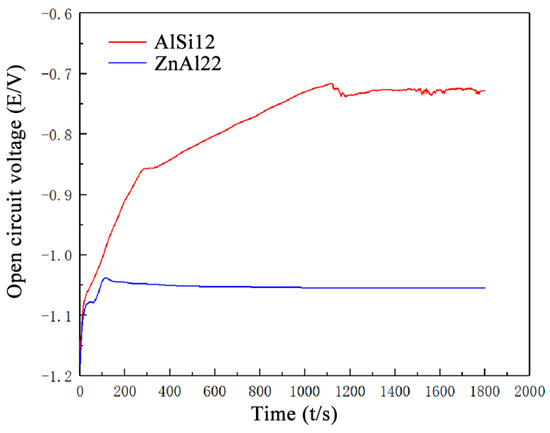 The open-circuit voltage-variation diagram of the joints welded with AlSi12- and ZnAl22-filler wire is illustrated in Figure 6. The open-circuit potentials of the joints welded with AlSi12- and ZnAl22-filler wire are presented in Table 4. The open-circuit potential of the joint welded with AlSi12-filler wire was −0.730 V, while that of the joint welded with ZnAl22-filler wire was −1.055 V. The higher open-circuit potential indicates that the joint welded with AlSi12 filler exhibited improved electrochemical stability and a reduced susceptibility to corrosion. The weld seam of the joint welded with AlSi12-filler wire primarily consisted of α–Al and Al–Si eutectic, facilitating the formation of a compact aluminum oxide film during the corrosion. The dense aluminum-containing oxide film covering the weld surface could play a role in isolating the corrosive liquid, resulting in increased potential and passivation of corrosion resistance. The dense oxide film containing aluminum on the surface of the weld could effectively isolate corrosive liquids, leading to an increased potential and enhanced resistance to corrosion.