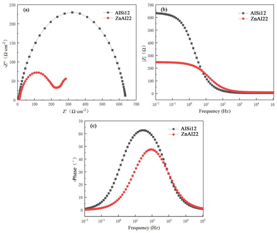 AC impedance diagram of AlSi12 and ZnAl22-filler wire-welded joints. (a) Nyquist diagram; (b) Mode-frequency Bode diagram; (c) Phase angle-frequency Bode diagram.