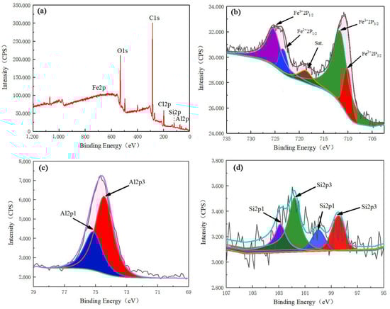 XPS spectra of passivation film on the surface of the joint welded with AlSi12-filler wire: (a) total spectrum, (b) Fe2p, (c) Al2p, and (d) Si2p.