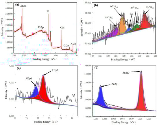 XPS spectra of passive film on the surface of the joint welded with ZnAl22-filler wire: (a) total spectrum, (b) Fe2p, (c) Al2p, and (d) Zn2p.