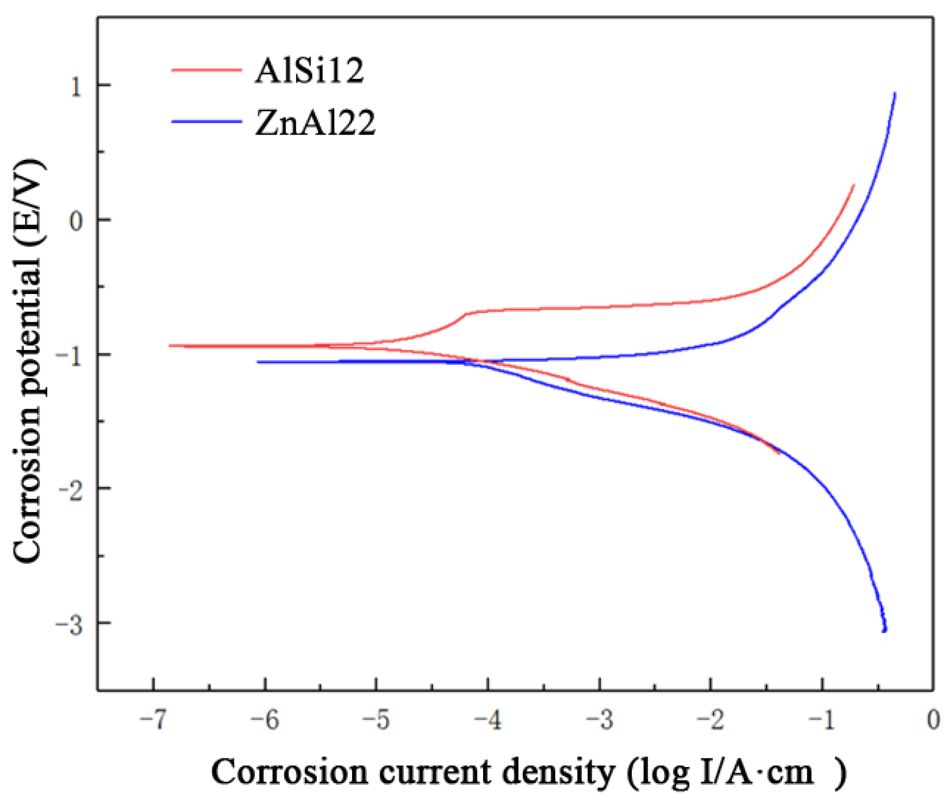 Figure 8 shows the polarization curves of the joints welded with AlSi12- and ZnAl22-filler wires. Table 5 shows the self-corrosion current density and self-corrosion potential of the test joints, as calculated using Tafel extrapolation [31]. The self-corrosion potential of the joint welded with AlSi12-filler wire (Ecorr–AlSi12) was −0.93788 V, while that of the joint welded with ZnAl22-filler wire (Ecorr–ZnAl22) was −1.0536 V. The self-corrosion current density of the joint welded with AlSi12-filler wire (Icorr–AlSi12) was 3.3578 × 10−5 A·cm−2, and the self-corrosion current density of the joint welded with ZnAl22-filler wire (Icorr–ZnAl22) was 1.7668 × 10−4 A·cm−2. A smaller self-corrosion current means slower corrosion, while a higher self-corrosion potential indicates stronger corrosion resistance [32]. Ecorr–AlSi12 was greater than Ecorr–ZnAl22, indicating that the joint welded with ZnAl22-filler wire was more susceptible to self-corrosion behavior. Additionally, the higher self-corrosion current density indicates that the joint welded with AlZn22-filler wire would corrode faster and had poorer corrosion resistance. Therefore, the joints welded using AlSi12-filler wire exhibited superior corrosion resistance.